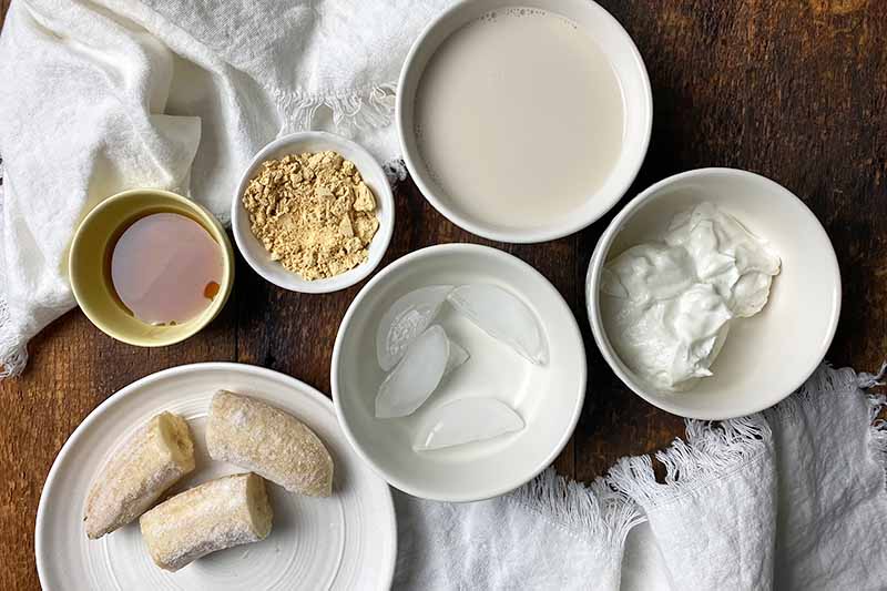 Measure out the milk, vanilla yogurt, sweetener, and powdered peanut butter. Set out the frozen banana and ice cubes.