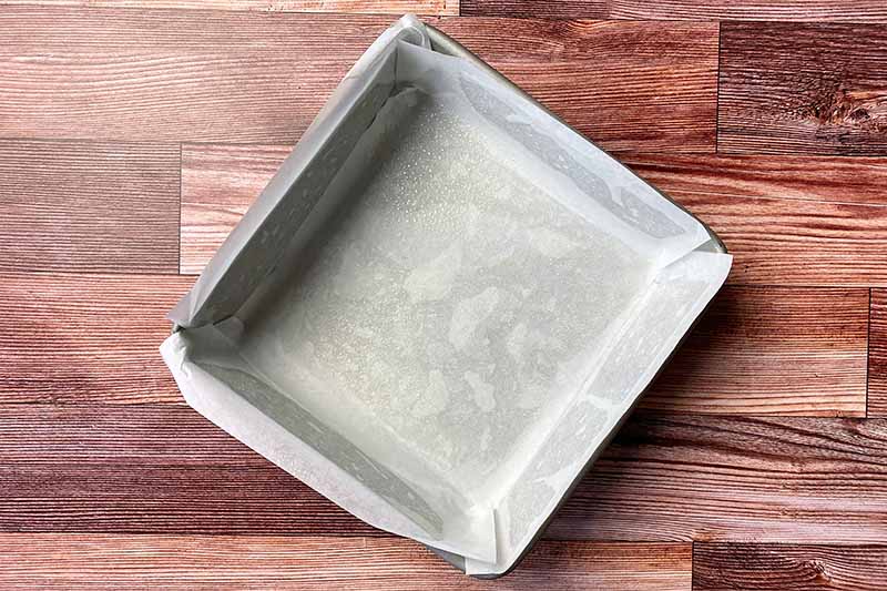 Simply create a sling, with two pieces placed perpendicular to each other in the bottom of the pan, and pressed into the sides. Leave a few inches of overhang for easy removal.